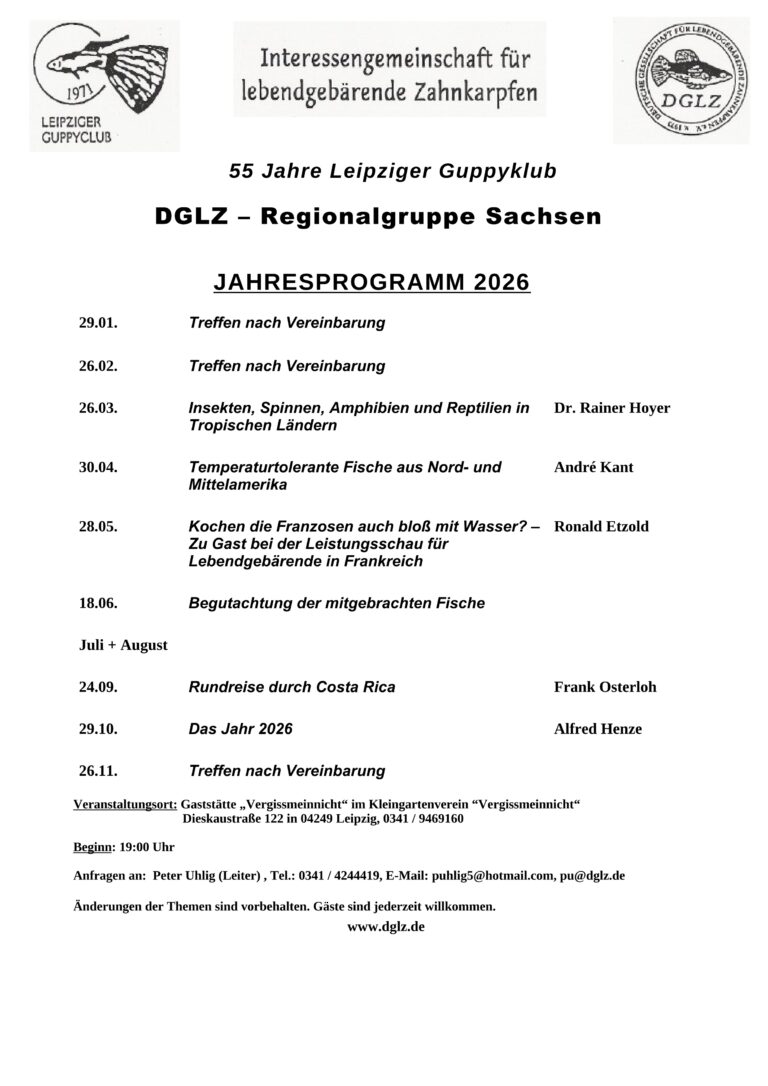 Treffen: jeden letzten Donnerstag im Monat Beginn: 19:00 Uhr Bitte wegen der aktuellen Lage Termine immer vorher nachfragen: Peter Uhlig (Leiter), Tel.: 0341 4244419 E-Mail: puhlig5@hotmail.com oder pu@dglz.de ( → Regionalgruppen) Veranstaltungsort: Gaststätte „Vergissmeinnicht“ im Kleingartenverein „Vergissmeinnicht“, Dieskaustraße 122, 04249 Leipzig, Tel.: 0341 – 9469160
